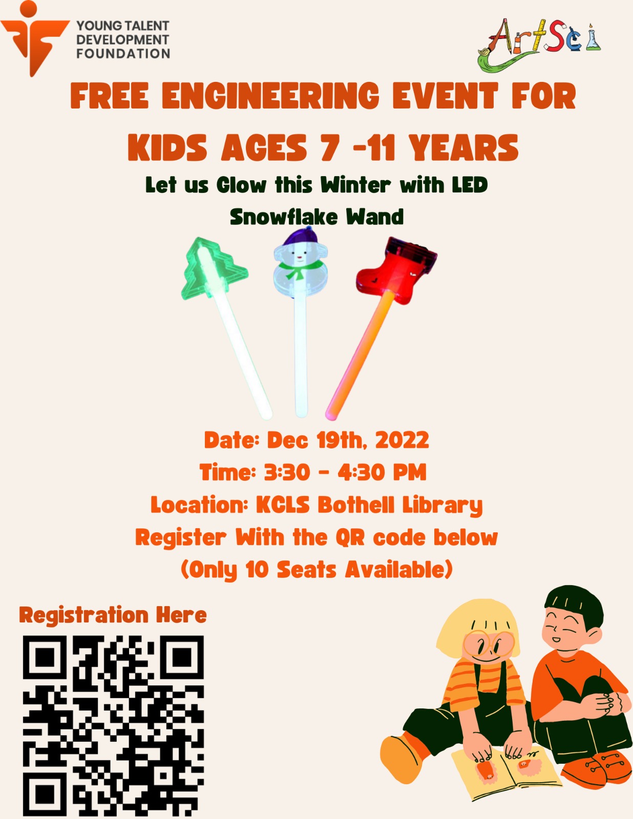 Hands-on engineering for ages 7–11: kids built LED snowflake wands while learning simple circuits. Hosted at KCLS Bothell Library.